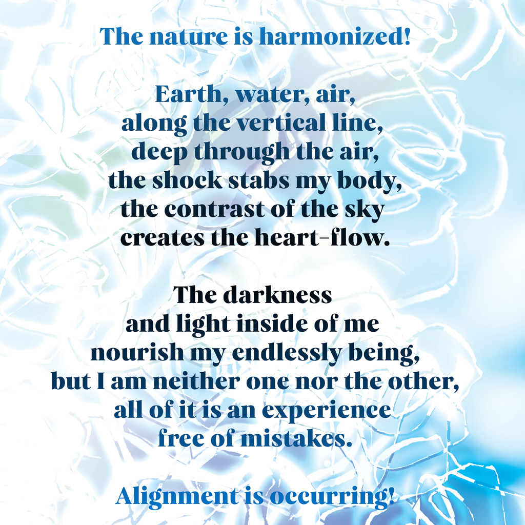 V vsako umetniško delo je vtisnjena vibracija ljubezni, ki želi okrepiti čutne zaznave gledalca in ga popeljati v globine njegovega lastnega bitja. Slike, v svojem bistvu odražajo veličino geometrije in osmišljajo moč kozmične zavesti. Preko katere vabijo gledalca, naj se prepusti opazovanju predstavljenih prizorov in prisluhne lastnemu srčnemu utripu.